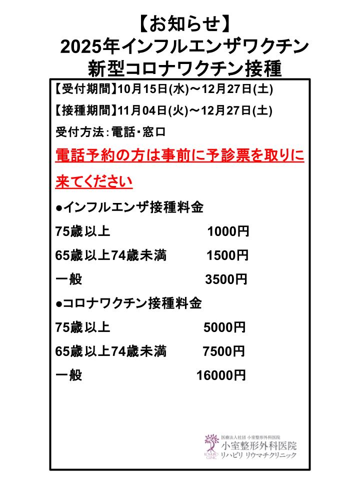 インフルエンザワクチン、新型コロナワクチン接種のお知らせ
